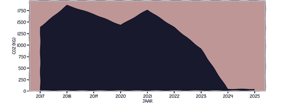 De bovenstaande grafiek laat zien dat het energieverbruik in ons huis leidde tot ongeveer 1,1 ton aan CO2-uitstoot in 2025. Dat is niet niets, maar toch ongeveer de helft van wat het was vóór de verduurzamingen, namelijk ongeveer 2,2 ton. Het is belangrijk om op te merken dat er een algemene dalende trend is, maar dat de warmtepomp in 2023 duidelijk de grootste bijdrage heeft gehad aan de daling.