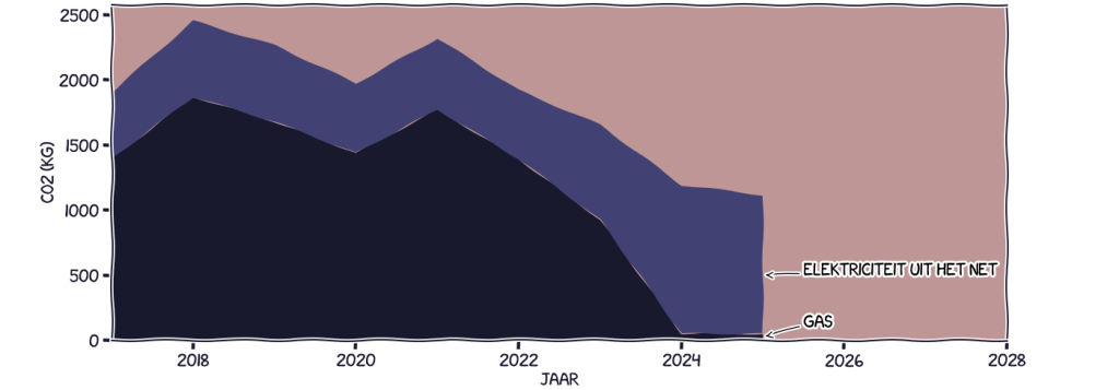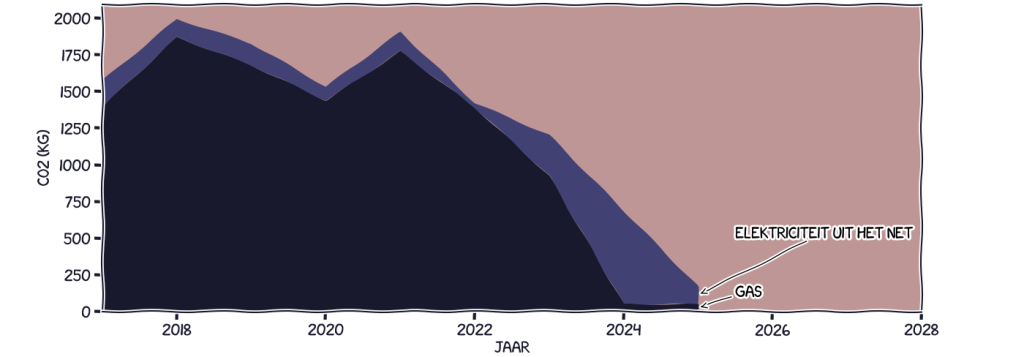 Toen we kwamen wonen in ons huis, gebruikten we per jaar ongeveer 950 kuub aan gas. Door te isoleren kregen we dit naar beneden tot zo’n 800 kuub. Het echte verschil in gasverbruik werd pas gemaakt toen we halverwege 2023 een warmtepomp kregen. Daarmee gebruiken we nu alleen nog gas om op te koken, en dat is bijna niets.